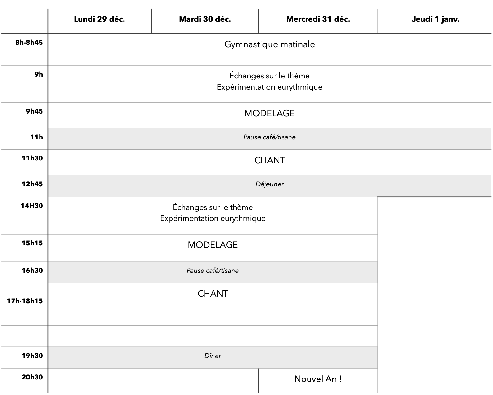 Nous mettrons aussi notre corps en mouvement avec des séances matinales de gymnastique bothmer et des moments quotidiens d’eurythmie pour stimuler notre recherche.