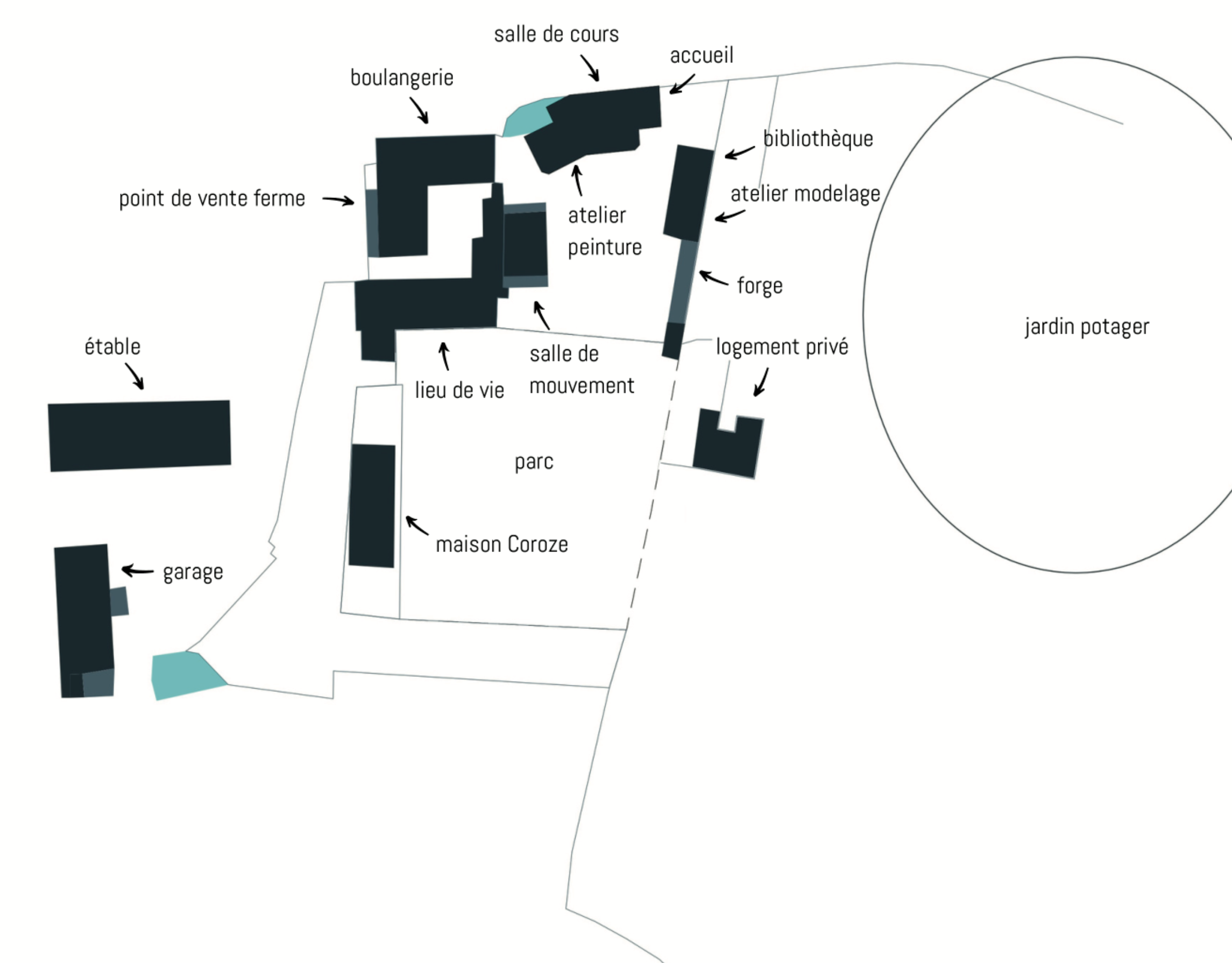 Le Centre a pour lieu de vie principal un ancien corps de ferme. La cuisine et la salle à manger sont au rez-de-chaussée de cet ancien bâtiment. À l’étage, 17 chambres individuelles sont aménagées ainsi que des sanitaires. En 2004-2005, la maison Coroze a été construite pour le logement des étudiants et des professeurs intervenants. Elle comprend 9 belles chambres supplémentaires et 1 studio.